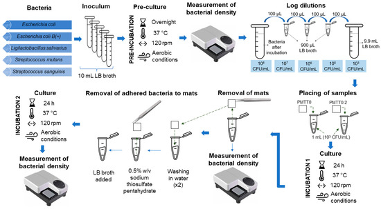 Next, 1 mL of fresh LB broth was added to evaluate the adhered bacteria in each sample. The treated mats were again incubated for 24 h under the already-described conditions. After this time, the microbial density of each tube was determined using the McFarland method. An overview of the explained protocol is presented in Figure 13.