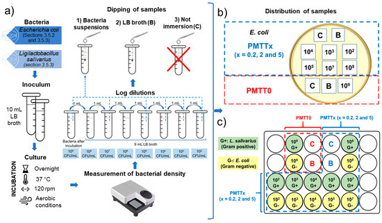 For this experiment, E. coli, E. coli (B+), L. salivarius, S. mutans and S. sanguinis were employed. Prior to the assays, bacteria were grown aerobically until reaching the exponential phase in LB broth. At this point, the obtained bacterial count was approximately 108 CFU/mL. From these suspensions, successive log dilutions were prepared in fresh LB broth until a bacterial density of 103 CFU/mL was achieved (Figure 13).
