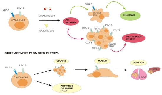 Patients can differ from each other with respect to P2X7A and B expression in their cells, and this could be a reason why some heal completely and others have a relapse of the pathology after therapy. The cell death-promoting role of P2X7A and the protection of P2X7B upon chemotherapy was also demonstrated in neuroblastoma (NB), a neuronal cancer that affects the sympathetic peripheral nervous system []. In a recent study by Arnaud Sampaio and colleagues, the resistance of P2X7B-expressing cells to vincristine was correlated with several changes in NB cell features []. The expression of P2X7B in NB cells impaired autophagy and favored the epithelial–mesenchymal transition and drug efflux through the induction of the multidrug-resistance-associated protein 1 (MRP-1) pump expression. Moreover, cells expressing P2XB are resistant to retinoic acid, which acts as a negative modulator of the transporter MRP-1 []. Cells expressing P2X7A show the opposite effects: they are sensitive to retinoic acid, inducing a decrease in MRP-1 pump expression and preventing drug efflux []. Moreover, they mediate autophagy and exhibit an epithelial phenotype. These findings suggest that the prevalence of one of the two isoforms in neuroblastoma cells could be useful for treatment decisions using P2X7 agonists/antagonists in combination with other compounds like retinoic acid. The same research group has previously demonstrated that the pro-inflammatory factor bradykinin promotes NB progression and metastasis, upregulating P2X7B []. Bradykinin is released by damaged cells as ATP and modulates different pathways involved in carcinogenesis. These effects of bradykinin were blocked by the administration of P2X7 antagonists known to have the same pharmacological activity on both A and B isoforms []. These two studies on neuroblastoma reveal that other signaling systems could favor P2X7B-expressing cells.