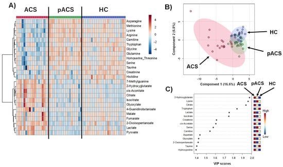 Plasma metabolomics profiles among ACS, pACS, and HC. (A) A heatmap of the metabolites showing large variations within the top 25 ranks. Red and blue indicate metabolites with higher and lower concentrations of each metabolite. (B) The score plots of the PLS-DA. A plot indicates a sample and 95% confidence intervals are colored. R2 = 0.732 and Q2 = 0.528 by five-fold CV. (C) VIP score of PLS-DA. The metabolites with a higher VIP contribute to the discrimination.