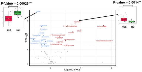 Volcano plots showing the metabolite concentration difference between the ACS and HC groups. The X-axis indicates the log2 of ACS/HC (averaged concentration). The Y-axis indicates −log10(p-value) of the Mann–Whitney test. The p-value was corrected by FDR. Y > 1.3 indicates an FDR-corrected p-value < 0.05. Two representative metabolites were visualized in the volcano plots. *** p-value < 0.0001 and ** p-value < 0.01.