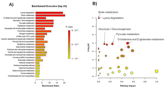 Enrichment (Figure 3A) and pathway analyses (Figure 3B) were conducted to understand the pathway-level differences between the ACS and HC groups. Both analyses ranked biotin metabolism and lysine degradation at the top. However, their pathway impacts were small (Figure 3B). Only one metabolite was mapped to biotin metabolism. Four metabolites were mapped to the lysine degradation pathway, comprising 25 metabolites. d-glutamine and d-glutamate metabolism pathways were ranked third and showed a relatively high pathway impact because three metabolites were mapped to the metabolism, including six metabolites.