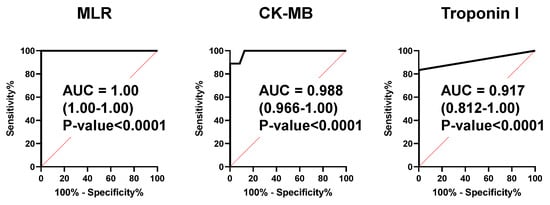 ROC curves to discriminate the ACS and HC groups of the MLR model, CK-MB, and troponin I. The AUC, 95% confidential interval, and p-value are presented.