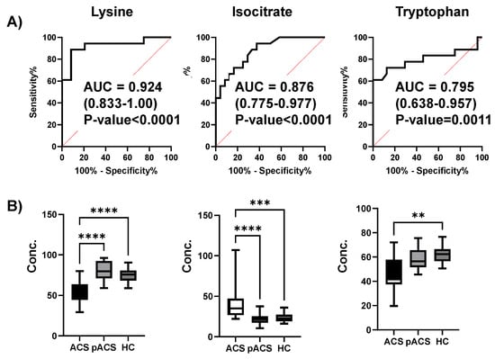 Three metabolites selected by the MLR model. (A) ROC curves to discriminate the ACS and HC groups. The AUC, 95% confidential interval, and p-value are presented. (B) Box plots to show the concentration among the ACS, pACS, and HC groups. Quantitative data were visualized in box plots where horizontal lines indicate 0%, 25%, 50%, 75%, and 100% of the data. Dunn’s post-test after the Kruskal–Wallis test. **** p-value < 0.0001, *** p-value < 0.001, and ** p-value < 0.01.