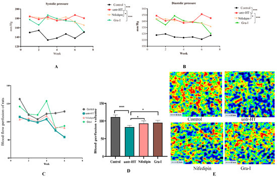 Changes in blood pressure and blood flow perfusion were recorded for each group of rats over a period of 7 weeks. As can be seen from the figure, rats in the Nifedipin group and Gra-I group exhibited an overall decreasing trend in systolic pressure (Figure 1A) and diastolic pressure (Figure 1B), while the systolic and diastolic pressure in the Control and untr-HT groups remained relatively stable.