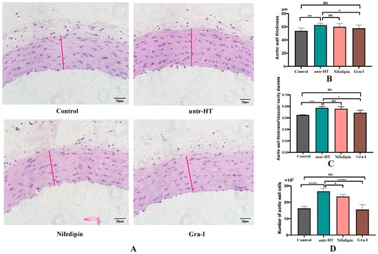 Figure 2 shows the differences in aortic morphology and structure among the groups of rats. Figure 2A displays the H&E staining results of aortic morphology and structure. The thickness of the arterial wall (Figure 2B) and the number of arterial wall cells (Figure 2D) were analyzed by ImageJ software (win-64). The ratio of the arterial wall thickness to the diameter of the lumen was calculated for each group of rats (Figure 2C). As shown in the figure, the arterial wall thickness of the untr-HT group rats was significantly higher than that of the Control group rats, while the arterial wall thickness of the Gra-I group rats was significantly lower than that of the untr-HT group rats. The number of arterial wall cells in the untr-HT group rats was significantly higher than that in the Control group rats, whereas the number of arterial wall cells in the Gra-I group rats was significantly lower than that in the untr-HT group rats. There was no significant difference in the number of arterial wall cells between the Control group and the Gra-I group rats.
