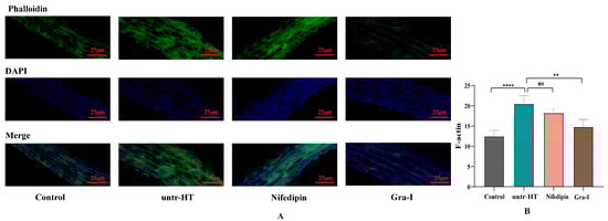 Figure 3 shows the expression of F-actin in the smooth muscle of the aorta in each group of rats. Figure 3A shows the staining of F-actin in the smooth muscle of the aorta using phalloidin. It can be seen from the figure that the positive rate of F-actin in the smooth muscle of the aorta in the untr-HT group was significantly higher than that in the Control group, while the positive rate in the Gra-I group was significantly lower than that in the untr-HT group. We further analyzed the differences in the positive area of F-actin in the smooth muscle of the aorta among the groups (Figure 3B). It can be seen from the figure that the positive area in the untr-HT group was significantly higher than that in the Control group, while the positive area in the Gra-I group was significantly lower than that in the untr-HT group, and there was no significant difference between the Control and Nifedipin groups.