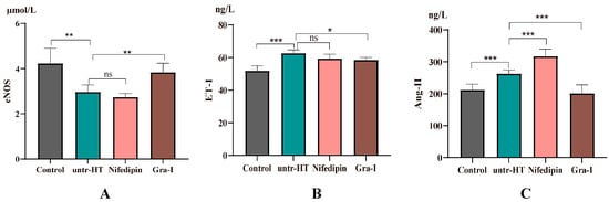 As shown in Figure 4A, the expression level of eNOS in the untr-HT group was significantly decreased compared to the Control group. Compared with the untr-HT group and the Nifedipin group, the expression level of eNOS in the Gra-I group was significantly increased. There was no significant difference in the expression level of eNOS between the Nifedipin group and the Gra-I group. Figure 4B shows the expression level of ET-1 in the serum of each group of rats. The expression level of ET-1 in the untr-HT group was significantly increased compared to the Control group, while the expression level of ET-1 in the Gra-I group was significantly decreased compared to the untr-HT group. There was no significant difference in the expression level of ET-1 between the Nifedipin group and the Gra-I group. Figure 4C shows the expression level of Ang-II in the serum of each group of rats. As shown in the figure, the expression level of Ang-II in the untr-HT group was significantly increased compared to the Control group. Compared with the untr-HT group, the expression level of Ang-II in the Gra-I group was significantly decreased, and the expression level of Ang-II in the Nifedipin group was significantly increased. Compared with the Nifedipin group, the expression level of Ang-II in the Gra-I group was significantly decreased.