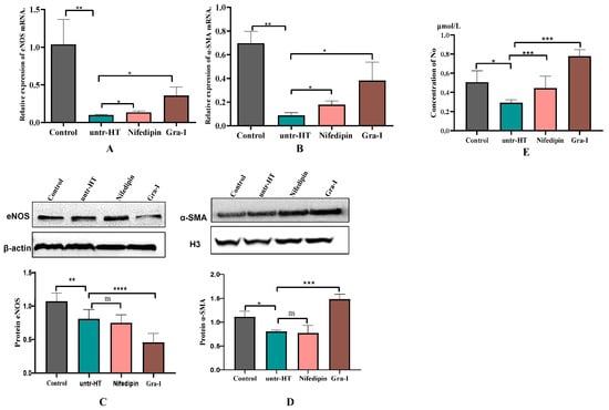 Figure 5 represents the expression levels of eNOS, α-SMA, and NO in the aortic tissues of rats from each group after 7 weeks of the experiment. Figure 5A,B show the mRNA expression levels of eNOS and α-SMA, respectively. Compared with the Control group, the expression levels of eNOS and α-SMA genes in the untr-HT group were significantly reduced. Compared with the untr-HT group, the expression levels of eNOS and α-SMA genes in the Nifedipin and Gra-I groups were significantly increased. Correspondingly, Figure 5C,D show the protein expression levels of eNOS and α-SMA in the aortic tissues, respectively. Compared with the Control group, the protein expression levels of α-SMA in the untr-HT group were significantly reduced. Compared with the untr-HT group, the expression level of the eNOS protein in the Gra-I group was extremely significantly decreased, while the expression level of the α-SMA protein was extremely significantly increased. There was no significant difference in the expression levels of the α-SMA protein between the Nifedipin group and the untr-HT group.