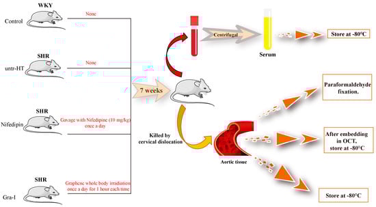 The treatment of each group of rats is shown in Figure 6. The Ca2+ channel blocker, nifedipine (Solarbio, SN8410, Beijing, China), was used as the drug for the Nifedipin group at a dose of 10 mg/kg, which was administered orally once a day for 7 consecutive weeks. The SHRs in the Gra-I group were irradiated with a graphene chamber (Supplementary Materials Figure S1, purchased from Chang Qing Xi Wang Shandong Medical Technology Co., Ltd. (Jinan, Chian)) for 1 h a day, for 7 consecutive weeks. During the experiment, tail artery pressure and blood flow perfusion were measured weekly. After 7 weeks, the rats were anesthetized with 2% pentobarbital sodium solution, and peripheral blood was collected from each group. The aortic tissue of each individual in each group was dissected. The dissected aortic tissue was divided into three parts: one was fixed with paraformaldehyde and stored at room temperature, one was packaged and frozen at −80 °C, and the other was embedded in OCT and rapidly frozen and directly stored at −80 °C. After being left undisturbed at room temperature for 2 h, the peripheral blood was centrifuged horizontally at 4 °C and 3000 r/min for 20 min. Next, the serum was collected and packaged and then frozen at −80 °C.