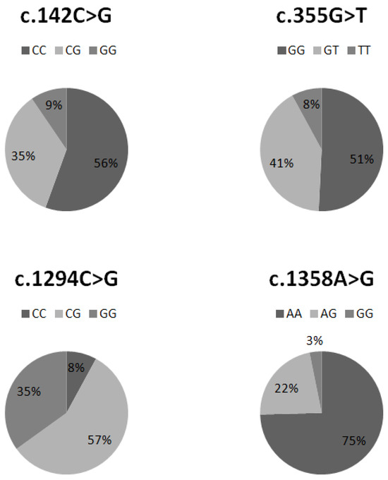 The percentage distribution of individual genotypes in the c. 142C > G, c. 355G > T, 1294C > G, and c. 1358A > G polymorphisms is illustrated in Figure 2.