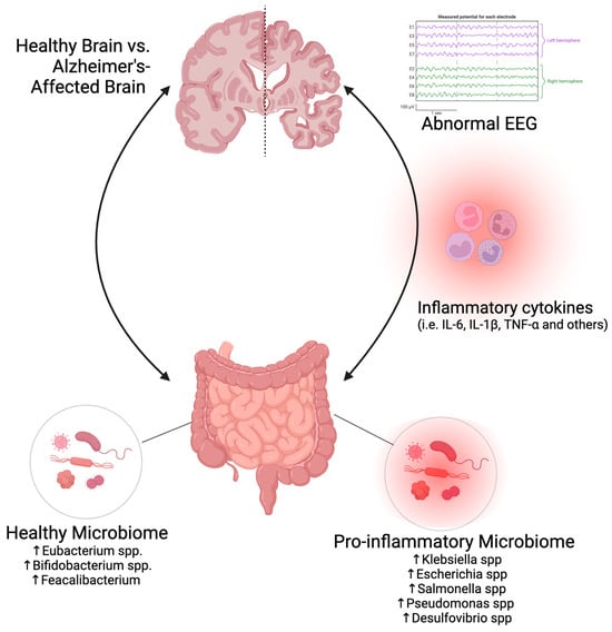 Potential AD biomarkers: EEG recordings in combination with a microbiome signature can be used as a potential biomarker for early detection of AD. Specific frequency characteristics and pattern changes observed in an EEG and microbiome (oral cavity and gut) signature in individuals with AD compared to cognitively healthy individuals. The brain and gut are connected through the gut–brain axis, and gut dysbiosis can induce inflammation in the gut, producing cytokines such as IL-6, IL-1β, TNF-α, and others released into the blood circulation, potentially causing neuroinflammation. An AD gut harbors a higher abundance of bacteria such as Klebsiella, Escherichia, Streptococcus, Salmonella, and Pseudomonas species, while a healthy gut harbors a higher abundance of anti-inflammatory bacteria, such as Eubacterium, Bifidobacterium, and Feacalibacterium spp.