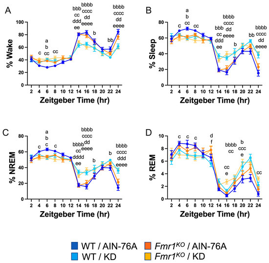 Effect of KD initiated at P95 on sleep architecture in WT and Fmr1KO mice as a function of time of day. EEG/EMG recordings were scored for wake, sleep, NREM, and REM activity, and the data were parsed into 2 h bins starting at Z0 (lights on). The average percent sleep state was plotted versus 2 h time bins for (A) % wake, (B) % sleep, (C) % NREM, and (D) % REM. Key for statistical significance: WT/AIN-76A versus Fmr1KO/AIN-76A = “a”, WT/AIN-76A versus WT/KD = “b”, WT/AIN-76A versus Fmr1KO/KD = “c”, Fmr1KO/AIN-76A versus WT/KD = “d”, Fmr1KO/AIN-76A versus Fmr1KO/KD = “e”, and WT/KD versus Fmr1KO/KD = “f”; a p ≤ 0.05, b p ≤ 0.05, bb p < 0.01, bbb p < 0.001, bbbb p < 0.0001, c p ≤ 0.05, cc p < 0.01, ccc p < 0.001, cccc p < 0.0001, d p ≤ 0.05, dd p < 0.01, ddd p < 0.001, dddd p < 0.0001, e p ≤ 0.05, ee p < 0.01, eeee p < 0.0001, f p ≤ 0.05.