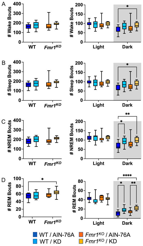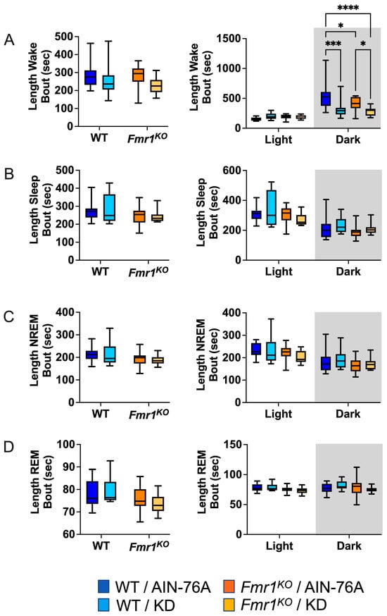 Sleep microarchitecture analysis included the number and length of wake, sleep, NREM, and REM bouts over 24 h and 12 h bins. There were no genotype-specific differences in bout number (Figure 3), in contrast to the prior study where Fmr1KO mice treated with KD initiated at P18 exhibited a decreased number of wake, sleep, and NREM bouts over the 24 h period and during the dark cycle compared to WT treated with KD [43]. There were also no KD-induced differences in WT bout numbers over the 24 h bin or the 12 h light bin with dosing commencing in adults, whereas the prior study with earlier dosing indicated statistically significant increases in wake, sleep, and NREM bout number as a function of KD in WT mice over the 24 h period and during the 12 h dark cycle [43]. Both studies found an increased number of NREM bouts in WT and REM bouts in both WT and Fmr1KO mice in response to KD during the dark cycle. This study did not replicate increased sleep bout number in WT mice with KD during the light cycle or decreased REM bout number in Fmr1KO mice with KD during the light cycle.