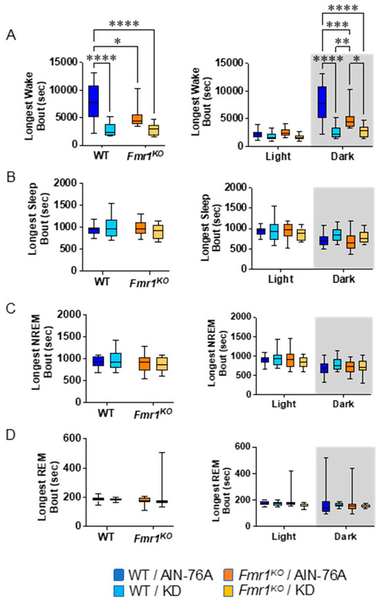 Effect of KD initiated at P95 on additional sleep microarchitecture phenotypes in WT and Fmr1KO mice as a function of light and dark cycles. EEG/EMG recordings were scored for wake, NREM, and REM activity, and the data were parsed into 24 h full day and 12 h light/dark bins starting at Zeitgeber time zero. Phenotype averages were plotted versus bin for (A) longest wake bout, (B) longest sleep bout, (C) longest NREM bout, and (D) longest REM bout. Key for statistical significance: * p ≤ 0.05, ** p < 0.01, *** p < 0.001, **** p < 0.0001, etc.