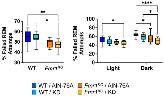 During REM scoring, the EEG pattern suggested the mice were trying to enter REM but failing. The EEG pattern needed to exhibit seven or more 4 s epochs of low-amplitude/high-frequency waves to be scored as REM. Instances of one to six epochs of low-amplitude/high-frequency waves were tallied as failed attempts to enter REM. The prior study indicated a statistically significant 20% decrease in failed REM attempts in Fmr1KO mice compared to WT fed AIN-76A during the dark cycle and was the only genotype-specific EEG phenotype in the mice dosed with the control diet since weaning. Here, in mice commencing dosing as adults, we found a 12% decrease in failed REM attempts in Fmr1KO mice compared to WT fed AIN-76A during the dark cycle. We also observed statistically significant decreases over the 24 h period and during the dark cycle comparing WT and Fmr1KO mice fed KD initiated at P95 (Figure 6).