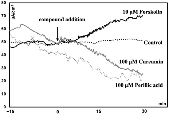 Compared to those in the control group, the ileum of mice treated with forskolin (10 μM) had greater Isc (p < 0.05). However, the VMA (100 μM) treatment group had a lower Isc (p = 0.05) than the control group (Table 1). Compared with the control, PA (100 μM) or curcumin (100 μM) tended to reduce Isc (p = 0.1) (Table 1). A representative diagram comparing the short-circuit current (Isc) following the administration of phytochemicals is shown in Figure 1.