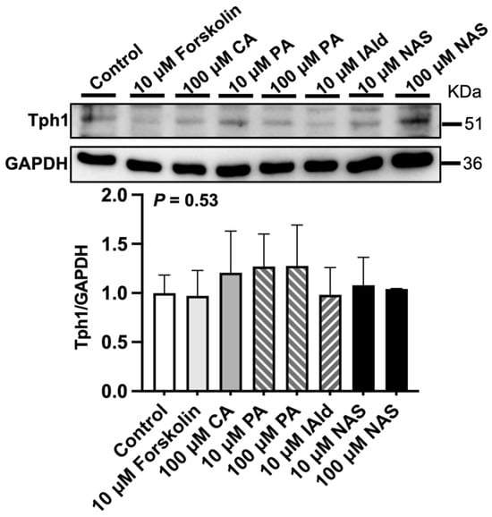 Analysis of the gene expression of 5-HT metabolism-related enzymes in the ileum revealed that forskolin (10 μM), PA or NAS treatment upregulated (p < 0.05) the expression of Tph1 compared with that in the control group (Figure 2). In addition, VMA, CA (100 μM), CGA (10 μM), ILA (100 μM), and IAld (10 μM) downregulated (p < 0.05) the expression of Tph1 (Figure 2). The protein abundance of Tph1 in the ileum was not affected by the abovementioned phytochemicals and Trp metabolites (Figure 3). In addition, 100 μM VMA, MurA, ILA or 10 μM IAld upregulated (p < 0.05) the expression of Maoa. However, PA (100 μM) and CGA (10 μM) downregulated (p < 0.05) Maoa expression (Figure 2).
