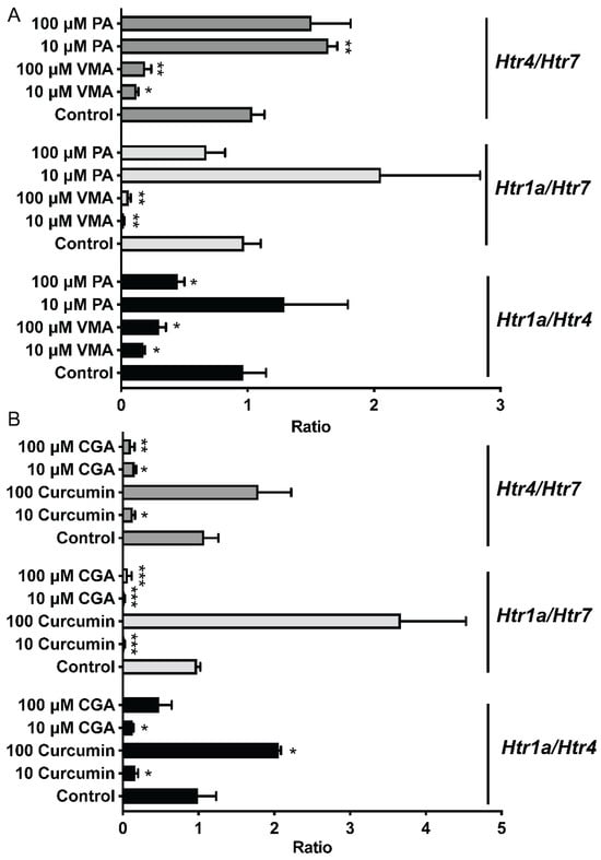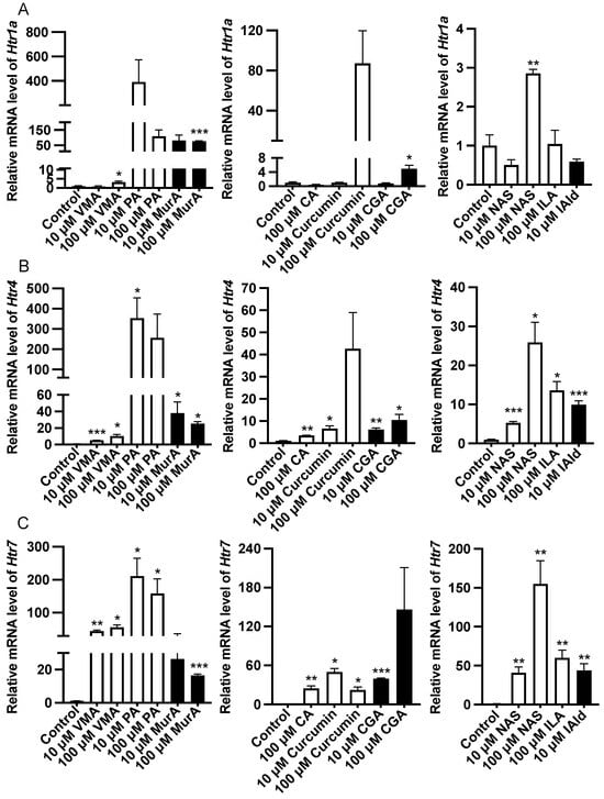 Analysis of the gene expression of the Htr revealed that 100 μM VMA, GA, and NAS or 10 μM MurA upregulated (p < 0.05) the expression of Htr1a (Figure 4). Treatment with 10 μM VMA, PA, MurA, curcumin, CGA, NAS or IAld or 100 μM CA or ILA upregulated (p < 0.05) the expression of Htr4 and Htr7 (Figure 4).
