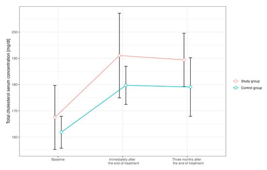 Compared to the baseline values, there was a significant increase in total cholesterol concentration in the study and control group immediately after the end of RT, which persisted for three months after the end of therapy (Figure 1). Only in patients from the study group, there was also a significant increase in LDL-cholesterol concentration when examined immediately after the end of RT (119.4 vs. 107.2 mg/dL, p = 0.048). In total, 19 out of all patients used a statin. After taking into account the use of statins in the analysis, it was found that an increase in total cholesterol concentration after oncological treatment was observed only among patients who did not use statins: initially, 186.8 mg/dL; immediately at the end of treatment, 206.2 mg/dL (p = 0.01); and three months after the end of treatment, 199.5 mg/dL (p = 0.005 compared to baseline).