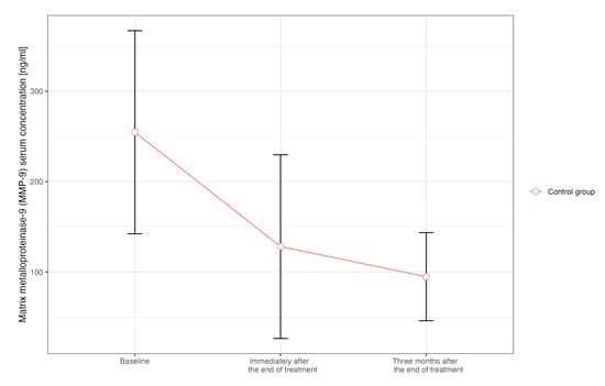 Change in the MMP-9 concentrations over time in patients from the control group (treated exclusively with chemotherapy).