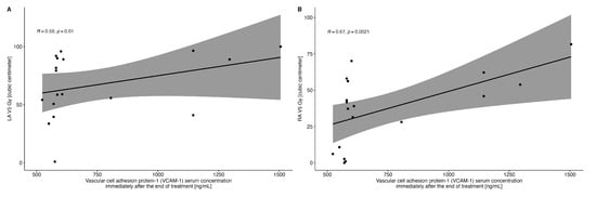 There was a significant correlation between the LA V5Gy volume, as well as RA V5Gy volume and VCAM-1 concentration measured immediately after the completion of RT (Figure 3).