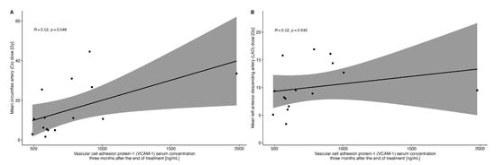 There was also a significant correlation between the radiation dose received using LAD (r = 0.52; p = 0.046) and Cx (r = 0.52; p = 0.048) and the VCAM-1 concentration measured at three months after the end of RT (Figure 4).