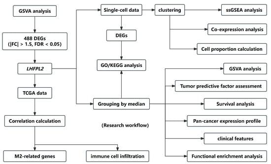 TAMs mainly exhibit the M2-like phenotype, playing a role in promoting tumor development. This study aims to identify new M2-related targets and systematically explore the role of these genes in tumors by integrating clinical data, sample information, and tumor-related gene sets. Potential M2 polarization-related genes were screened using the differential gene expression analysis of sequencing data, among which LHFPL2 was identified. This gene encodes a transmembrane protein and belongs to the lipoma HMGIC fusion partner (LHFP) gene family along with LHFP and LHFPL1, 3, 4, and 5 []. Since its discovery, only a few studies have confirmed that members of this family may be related to human hearing disorders [,] and renal developmental abnormalities [], with limited research available. Therefore, we further analyzed its expression and prognosis in tumors, evaluated its potential as a tumor prognostic factor, and assessed its relationship with M2 macrophage polarization, investigating the mechanism by which LHFPL2 affects tumor progression, thus providing new insights into tumor treatment directions.