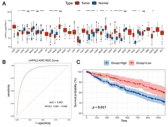 The overall workflow of this study is illustrated in Figure 1. The proportion of macrophages varies across different malignant tumors. Given the heightened enrichment of macrophages in liver [,], renal [,,], and gastric cancers [], we designated the Gene Set Variation Analysis (GSVA) score for the macrophage M2 polarization-related gene set as the M2 score. We stratified cancer samples into high and low groups based on the median M2 score, then observed the expression levels of various M2-related genes in each group, identifying differential genes and singling out LHFPL2 as a target gene (Supplementary Figure S1). The analysis of sequencing data and clinical information from The Cancer Genome Atlas (TCGA) revealed significant upregulation of LHFPL2 transcription levels in certain cancers compared to normal samples, particularly evident in kidney renal clear cell carcinoma (KIRC) (Figure 2A). Receiver Operating Characteristic (ROC) curves were employed to evaluate the potential as a tumor-predictive factor of LHFPL2. The Area Under the Curve (AUC) values for LHFPL2 upregulation across five tumor types were calculated, and the AUC values are consistently higher than a random value (AUC > 0.5). Notably, the highest AUC value for LHFPL2 was observed in KIRC, reaching 0.903 (Figure 2B and Figure S2). Furthermore, Kaplan–Meier analysis illustrated a significant association between elevated LHFPL2 expression and overall survival (OS) in KIRC, where patients with high LHFPL2 expression exhibited significantly poorer prognosis (p = 0.017, Figure 2C), contrasting with the absence of similar correlations in the other four cancer types (Supplementary Figure S3). Therefore, our emphasis will be on investigating the role of the LHFPL2 gene in KIRC.