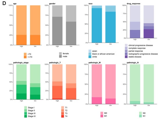 Gene expression in tumor and normal tissues from TCGA were analyzed using the “ggplot” (version 3.3.5) and “ggpubr” (version 0.4.0) packages of R (version 4.3.1). A comparison was conducted between the two groups. Pathological staging refers to the severity assessment of tumors based on tissue samples obtained from surgery or biopsy, categorized into stages I through IV. The American Joint Committee on Cancer (AJCC) classifies cancer based on the size and extent of the primary tumor (T0, T1, T2, T3, T4), regional lymph node involvement (N0, N1, N2, N3), and the presence of distant metastasis (M0, M1). Tumors are classified based on their response to drugs into clinical progressive disease, complete response, partial response, radiographic progressive disease, and stable disease. Analyzing the proportion of different statuses in the LHFPL2-high and -low groups according to these classification criteria reveals the relationship between LHFPL2 and the clinical characteristics of tumors. Specific classification information is sourced from https://link.springer.com/chapter/10.1007/978-1-4614-2080-4_1 (accessed on 1 April 2024).