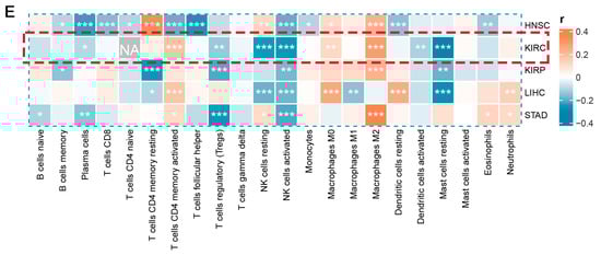 Immune infiltration profiles of LHFPL2. (A) Abundance differences of six major subtypes of immune cells between high and low expression groups of LHFPL2 in KIRC. The area of the sectors represents the proportion of immune cell infiltration. (B,C) Variations in the proportion of M2 macrophages (B) and activated NK cells (C) between high and low expression groups of LHFPL2 in KIRC. *** p <0.001, **** p < 0.0001. (D) Correlation between LHFPL2 expression and the expression levels of various immune checkpoint markers in KIRC. The size and color intensity of the circles represent the correlation coefficients. Larger circle areas and deeper colors indicate stronger correlations between two genes. Positive correlations are shown in red, while negative correlations are shown in blue. * p < 0.05, ** p < 0.01, *** p < 0.001. (E) Heatmap illustrating the correlation between LHFPL2 expression levels and the proportions of 22 types of immune cells in KIRC. The depth of color represents the magnitude of the correlation coefficient, with positive correlation indicated by orange and negative correlation indicated by light blue. The significance differences were calculated using the Wilcoxon Test. * p < 0.05, ** p < 0.01, *** p <0.001; no asterisk indicates no significant correlation. NA represents missing data, and the red dashed box highlights the renal cell carcinoma we are studying.