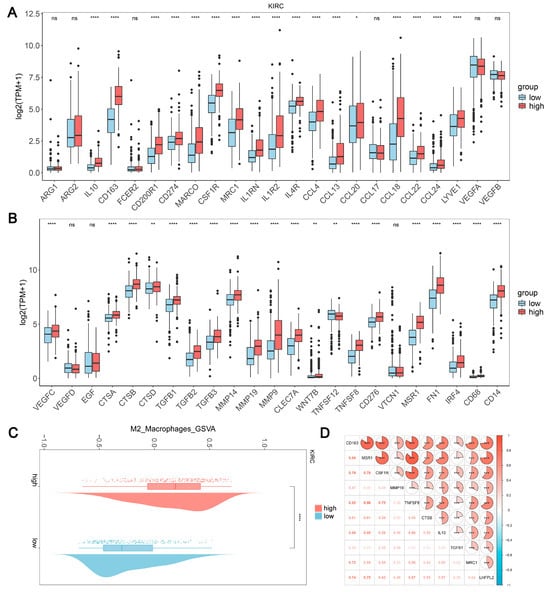 RCC, a malignant tumor originating from renal tubular epithelial cells [], accounts for about 85% of all malignant kidney tumors and significantly impacts human health. Current treatments benefit few patients, underscoring the need for effective therapies []. TAMs in TME, mainly M2 phenotype, play a major role in tumor progression and immune evasion [,,]. Their immunosuppressive and tumor-promoting effects hinder RCC therapy. Targeting TAMs to modulate their phenotype and function may lead to new therapeutic strategies. This study identified a novel M2 macrophage-related gene, LHFPL2, by calculating the GSVA score of M2 macrophages. We analyzed its clinical characteristics and computed its significant correlations with the abundance of various immune cells, expression levels of M2 marker genes, immune checkpoint levels, and tumor-related pathways by using gene expression matrices from 33 tumor types in the TCGA database and clinical information from RCC tumor samples. These findings were further validated using single-cell transcriptome data, thereby confirming the potential of this gene as a therapeutic target for treating RCC associated with M2 macrophages.