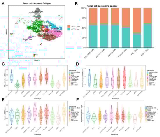 Single-cell data analysis reveals the association between LHFPL2 gene and M2 polarization in renal clear cell carcinoma. (A) UMAP visualization of myeloid cells in renal cell carcinoma patients. Myeloid cells are divided into 10 clusters, including various dendritic cells (DCs), tumor-associated macrophages (TAMs), and monocytes, which are distinguished by different colors. (B) Proportions of high- and low-LHFPL2-expressing cells in six TAM subclusters. (C–F) ssGSEA scores of M2 polarization (C), immune escape (D), hypoxia (E), and angiogenesis (F) in TAM subclusters.
