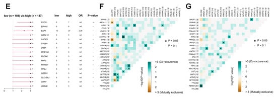Genomic alterations of different LHFPL2 expression groups. (A,B) The waterfall plot illustrates the top 10 frequently mutated genes in high- (A) and low-LHFPL2 (B) expression groups in KIRC. Genes are arranged in descending order based on mutation frequency, and mutations are categorized and labeled with different colors. (C,D) The box plot illustrates the overall distribution of six different transformations in high- (C) and low-LHFPL2 (D) expression groups, presented as stacked bar charts to display the conversion ratios in each sample. (E) The forest plot displays the top 16 significantly mutated genes in the high-LHFPL2 group relative to the low-LHFPL2 group. OR represents the ratio of mutation frequencies between the high- and low-LHFPL2 expression groups. “Inf” indicates infinity. * p < 0.05, ** p < 0.01. (F,G) The heatmap displays the co-occurrence or mutual exclusivity of 25 mutated genes between the high- (F) and low (G)-LHFPL2 groups. Green and brown represent the probabilities of two genes undergoing either co-occurrent mutations or mutually exclusive mutations, with darker colors indicating higher probabilities.