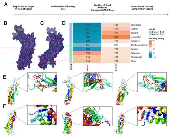 To further understand the potential of LHFPL2 as a drug target, we docked the protein structure with over 800,000 compounds and 1614 FDA-approved drugs to screen for compounds with inhibitory potential against LHFPL2 (Figure 7A). Based on the predicted structure of LHFPL2 protein, six molecular docking pockets were identified using Discovery Studio software. The two largest pockets were selected for subsequent docking operations, named Pocket 1 and Pocket 2 (Figure 7B,C). Subsequently, UniDock was used to dock LHFPL2 with a dataset of one million compounds from the zinc compound library and 3000 drugs from the FDA database, calculating the affinity scores between the protein and different ligands. Lower docking scores indicate stronger binding between compounds and the protein. Results revealed that, for Pocket 1, FDA drugs Conivaptan (vasopressin receptor antagonist), Nilotinib (Bcr-Abl tyrosine kinase inhibitor), and Olaparib (PARP inhibitor) had the highest affinity scores, with values of −9.47, −9.35, and −9.31, respectively (Figure 7D). Among compounds, subTS_HIT102125848, subTS_HIT104720933, and subTS_HIT101532189 exhibited the highest affinity scores, with values of −12.48, −11.69, and −11.55, respectively (Supplementary Figure S9A). For Pocket 2, FDA drugs Dihydroergotamine, Avodart, and Azelastine had the highest affinity scores, with values of −8.14, −7.79, and −7.77, respectively (Figure 7D), while compounds subTS_HIT213615638, subTS_HIT213008249, and subTS_HIT213824420 had the highest affinity scores, with values of −9.65, −9.48, and −9.44, respectively (Supplementary Figure S9A). The binding poses and sites are shown in Figure 7E,F and Supplementary Figure S9B,C. The interaction between the LHFPL2 protein and compounds or FDA-approved drugs was also depicted with a 2D diagram (Supplementary Figure S10).