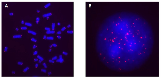 Representative images of telomeres in metaphase chromosomes (A) and interphase nuclei (B) of blood leukocytes are shown by a Cy3-labeled PNA probe (red) with DAPI counterstaining (blue). The images were captured at 100× magnification using CoolCube1 camera on a Zeiss fluorescent microscope (GmbH, Altlussheim, Germany).