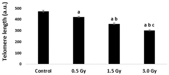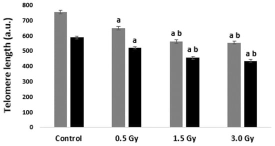 Statistical analysis showed TL shortening in both metaphase chromosomes and interphase nuclei after irradiation with doses of 0.5, 1.5, and 3.0 Gy (p < 0.05) (Figure 2).