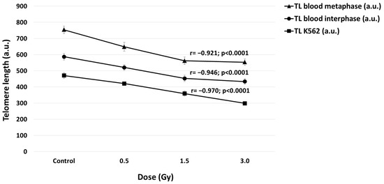 Spearman’s rank correlation analysis indicates dose-dependent telomere shortening both in metaphase chromosomes (r = −0.921; p < 0.0001) and interphase nuclei (r = −0.946; p < 0.001) of blood leukocytes and in interphase nuclei of K562 cells (r = −0.970; p < 0.0001) (Figure 4).