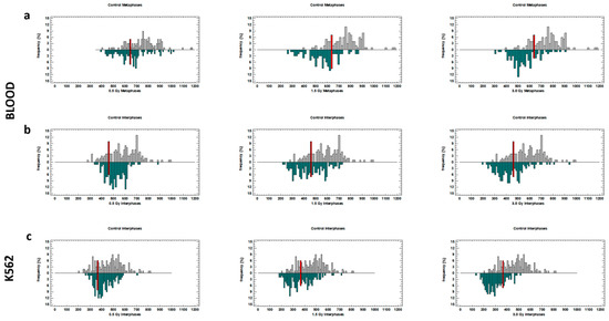 Figure 5 shows the distribution of TLs, and the red bars indicate the 20th percentile of the TL of the corresponding control. A Kolmogorov–Smirnov test revealed statistically significant differences between the distributions of TLs in irradiated and control blood and K562 cells. Significant differences between irradiation doses (with the exception of doses 1.5 and 3.0 Gy in metaphase chromosomes and interphase nuclei of blood leukocytes) were also revealed. The differences obtained coincide with the results of comparing the mean TL values using the Kruskal–Wallis test and confirm radiation-induced telomere shortening. Thus, an increase in the proportion of the shortest telomeres with increasing radiation doses in all experimental variants was detected (Table 2).