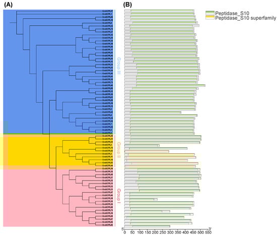 Phylogenetic and conserved domain analysis of the GmSCPL family. (A) Maximum likelihood (ML) phylogenetic tree of GmSCPLs using IQ-tree with LG+R4 model. All GmSCPLs are divided into three phylogenetic groups. (B) Conserved domains of all identified GmSCPLs.