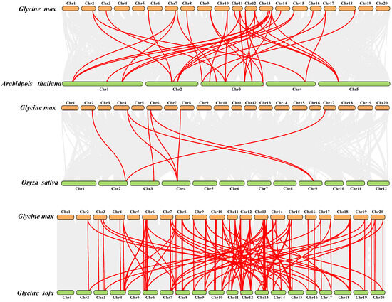To delve deeper into uncovering the evolutionary links within the SCPL gene family, we conducted a syntenic analysis aimed at identifying SCPL paralogous gene pairs within soybean (G. max) and SCPL orthologous gene pairs between soybean and monocotyledonous plants (O. sativa) as well as dicotyledonous plants (Arabidopsis and G. soja) using Multiple Collinearity Scan Toolkit (MCScanX, Athens, Greece). We identified 40 paralogs in soybean (Gm-Gm) (Table S3). Among these, 33 orthologous gene pairs were detected between Arabidopsis and soybean (Gm-At), 117 orthologous gene pairs between G. soja and soybean (Gm-G. soja), and only eight SCPL orthologous gene pairs between rice and soybean (Gm-Os) (Figure 4). These findings suggest a close linkage between SCPL genes in soybean and those in G. soja, possibly due to their close genetic relationship [25,26,27].