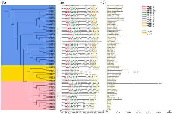 Examining the exon–intron architecture of genes provides valuable insights into their evolutionary paths and functional diversification. We conducted an analysis of the gene structure and conserved motifs of GmSCPLs, revealing a range of exon numbers from 1 to 14 (Table 1). Notably, this analysis highlights a degree of conservation in exon–intron structures within each branch of the evolutionary tree (Figure 6C).