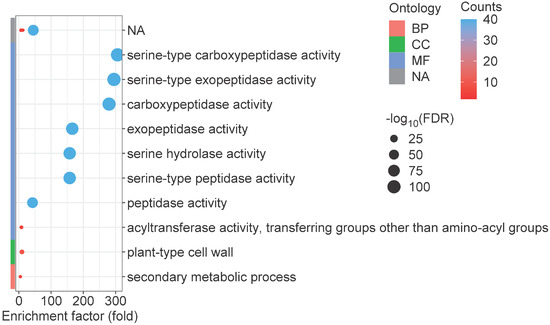 Gene Ontology (GO) enrichment analysis is commonly employed as a fundamental approach for elucidating gene functionality [47]. Consequently, we conducted GO enrichment analysis of all identified GmSCPL members. GmSCPLs within the biological processes (BP) category were enriched in secondary metabolic process; those within the cellular components (CC) category were associated with plant-type cell wall; while those within the molecular function (MF) category were primarily enriched in serine-type peptidase activity, serine-type exopeptidase activity, serine-type carboxypeptidase activity, exopeptidase activity, serine hydrolase activity, and peptidase activity (Figure 8). These findings suggest that the GmSCPL family may be involved in the stress response and regulation of plant cell wall dynamics.