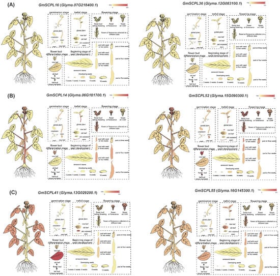 Differential expression of selected GmSCPLs in different tissues by RNA-seq. (A) Expression profiles of GmSCPL16 (Glyma.07G218400.1) and GmSCPL36 (Glyma.12G083100.1) across various soybean tissues at different developmental stages. (B) Expression profiles of GmSCPL14 (Glyma.06G181700.1) and GmSCPL52 (Glyma.15G090300.1) across various soybean tissues at different developmental stages. (C) Expression profiles of GmSCPL41 (Glyma.13G029200.1) and GmSCPL55 (Glyma.16G145300.1) across various soybean tissues at different developmental stages. The heatmaps indicate the expression levels, with red representing high expression and yellow representing low expression. Each diagram illustrates the expression patterns in tissues such as roots, stems, leaves, flowers, and pods, providing a comprehensive overview of the spatial and temporal expression of these genes.