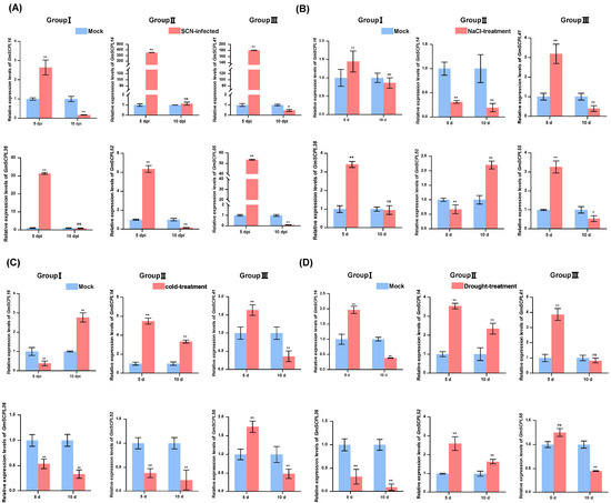 Previous studies have established that SCPLs in plants are crucial for various physiological and biochemical functions, and their transcription is influenced by a range of stimuli, including pathogenic attacks and environmental stresses such as drought, salt, and cold [19,20,49]. To investigate the roles of GmSCPLs under biotic and abiotic stress conditions, we analyzed how soybean cyst nematode (SCN, Heterodera glycines), cold, drought, and saline-alkali stresses affect the transcription levels of selected GmSCPL genes. Our data show significant up-regulation of all selected genes five days after inoculation with SCN (5 dpi) (Figure 10A). Ten days post-SCN inoculation, GmSCPL16, GmSCPL52, GmSCPL41, and GmSCPL55 showed significant expulsion, whereas GmSCPL14 and GmSCPL36 exhibited no significant changes (Figure 10A). Under saline-alkali or cold stress, GmSCPL41 and GmSCPL55 (Group Ⅲ) displayed a strong induction on the fifth day and suppression on the tenth day (Figure 10B,C). Regarding drought stress, the expression of GmSCPL41 was significantly induced, while GmSCPL55 displayed no significant change (Figure 10D). The response of Group Ⅰ and Ⅱ members varied significantly under different abiotic stresses. For example, GmSCPL16 and GmSCPL36 (Group Ⅰ) showed strong induction under saline-alkali stress on the fifth day, but their expression was not significantly changed under the same condition on the tenth day (Figure 10B). As for GmSCPL14 and GmSCPL52 (Group Ⅱ), their expression was vitally suppressed under saline-alkali stress while induced under drought stress on the fifth day (Figure 10B,C). These findings suggest that GmSCPLs play significant roles in response to nematode infection and various environmental stresses.
