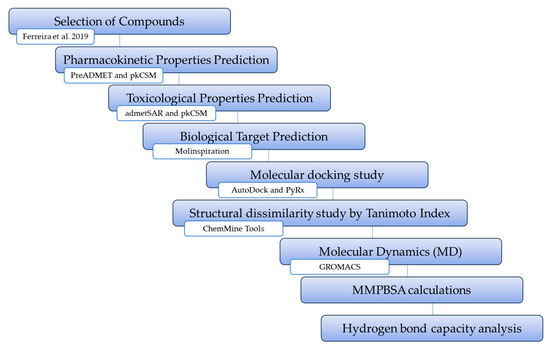 The in silico study of pharmacokinetic parameters is an essential tool for the discovery, selection, and development of bioactive compounds with a view to preclinical and clinical studies due to their speed, low cost, and the reduction in the number of experiments involving animals. In this work, PreADMET and pkCSM web-based tools were used for this task. PreADMET (https://preadmet.webservice.bmdrc.org/ (accessed on 20 August 2021)) is a free access web server capable of predicting ADMET properties based on the lower binding energy of molecular structures with the receptor protein. On the other hand, the pkCSM platform (http://biosig.unimelb.edu.au/pkcsm/prediction (accessed on 25 August 2021)) integrates the use of structural signatures based on graphs for the theoretical prediction of ADMET characteristics in the discovery of new drugs [13]. Table 1 shows the results of the 22 molecules and reference compounds after being subjected to the theoretical prediction.