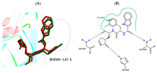 (A) Superposition of crystallographic ligand pose (in green) with the experimental ligand pose (in red) obtained from molecular docking validation, the blue ribbons belong to the protein structure (Mpro); (B) 2D interaction of the residues of molecule FJC with the target Mpro obtained in the validation of molecular docking.