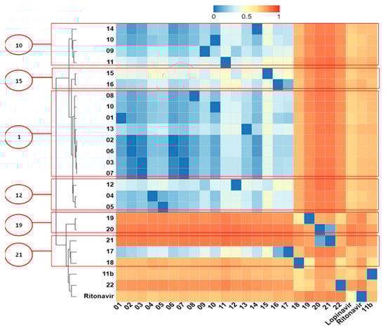 The heatmap of the hierarchical cluster of the molecules is illustrated in Figure 3, based on the Tanimoto Index. The similarity analysis provided valuable insights into how each fragment formed possible interactions at the binding site of the molecular targets. This analysis could also facilitate the design of molecules with increased chemical diversity. The results analysis obtained in the molecular docking and Tanimoto Index studies allowed the identification of six ligands (1, 10, 12, 15, 19 and 21) as potential inhibitors of Mpro.