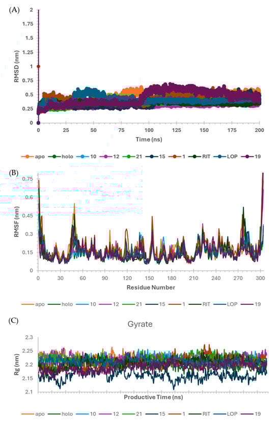 Molecular Dynamics (MD) simulation data for the main protease of SARS-CoV-2 (SARS-CoV-2 Mpro) complexes generated for GROMACS-2021 [30,31,32,33,34,35]. (A) RMSD values (averaged mean ± standard deviation) for each system: apo (0.51 ± 0.03), holo (0.34 ± 0.03), 10 (0.36 ± 0.02), 12 (0.32 ± 0.02), 21 (0.34 ± 0.02), 15 (0.47 ± 0.05), 1 (0.36 ± 0.03), ritonavir RIT (0.35 ± 0.02), lopinavir LOP (0.39 ± 0.02) and 19 (0.34 ± 0.03); (B) RMSF and (C) Radius of Gyration, both from the productive phase (50–100 ns).