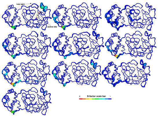 Comparing the Mpro structure fluctuations (3D RMSF) within all complexes, we distinguished their overall protein folding stability, mainly at active sites represented by catalytic residues (His41 and Cys145, Figure 4). These data correlate with the crystallographic structure of Mpro, where active site residues are well-solved in electron density maps with a resolution of 1.50 Å [29]. Additionally, we analyzed their secondary structure stability using the DSSP 3.1.4 module [36,37,38] installed on GROMACS-2021 [30,31,32,33,34,35]. All Mpro complexes maintained their secondary structure stability during our simulation time (Figure S1). Some regions presented higher fluctuations in Mpro structure, mostly at some loops and at the N- and C-terminals (Figure 4). The SARS-CoV-2 Mpro crystal had a long loop region of domain II (residues 185–200) connecting to domain III, and this region is highly variable as pointed out by the superposition of 12 Mpro crystal structures [29]. Our MD data revealed that these loops on domain II fluctuated more than other secondary protein structures, corroborating with this experimental study. Previous results also cited the interface region among Mpro protomers composed of domain II residues as unstable [23,29,39] and these data were also visualized in our simulations (Figure 5).